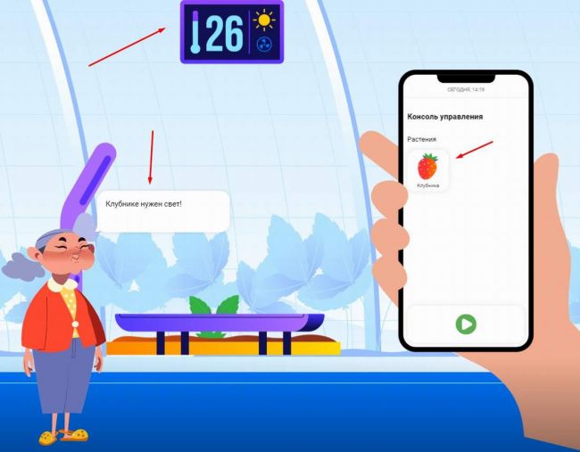 Теперь мы у бабушки и нужно помочь ей вырастить клубнику. Для лучшего результата она купила специального робота, управлять которым можно прямо из смартфона! Для того, чтобы справиться с заданием, внимательно читайте, чего хочет бабушка и выполняйте ее пожелания на смартфоне ровно в той последовательности, в какой она их озвучивает.