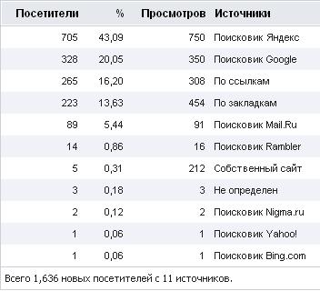 Сейчас же такая посещаемость не связана с какой-то отдельной статьёй, накруткой в той или иной соцсети или каким-то очень удачным репостом: в источниках посещений как обычно 43% от Яндекса, 20% от Гугла, остальное - по ссылкам, закладкам и с прочих источников. Соцсети практически не работают, внося в общий поток менее 1%.
