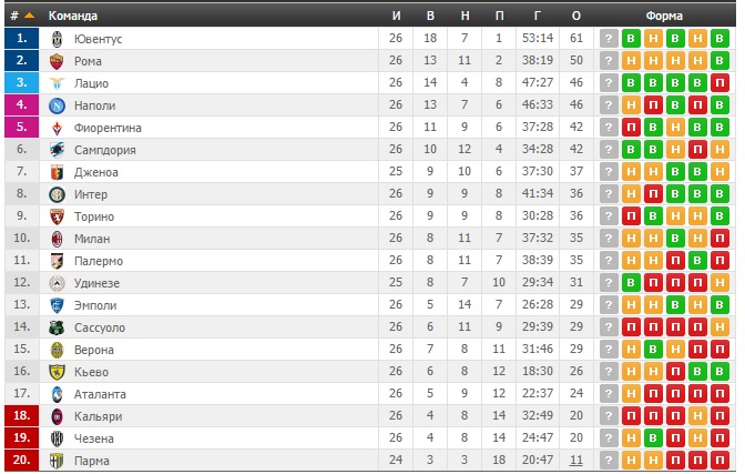 Итальянский футбол всегда был и остается одним из самых сильных на континенте. Футбол для этой страны является чем-то вроде народной забавы, и стар и млад интересуется этим видом спорта. Именно поэтому итальянские футбольные клубы считаются одними из сильнейший на континенте. Государство уделяет большое внимание развитию спорта, в каждом городе есть футбольные клубы, в крупных из несколько. Например, в Милане – одноименный ФК Милан и ФК Интер, в Риме – ФК Рома и ФК Лацио. В городе самого титулованного клуба страны Ювентус есть еще парочка клубов, самый известный из которых - Торино. Как и в других чемпионатах в итальянском есть костяк фаворитов, которые из года в год делят призовые места. Сезон – 2014-2015 не стал исключением. Хоть сезон еще не закончен, но уже можно сказать кто займет призовые места и будет представлять Италию а Лиге Чемпионов и Лиге Европы. Более подробно о расстановке клубов в игровой таблице можете смотреть в таблице.
