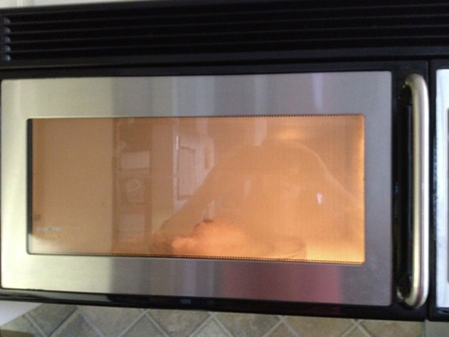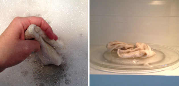 Лайфхак с очисткой грязной микроволновой печи заключается в том, что необходимо хорошенько намочить и намылить тряпку для посуды (чтоб вода с нее капала), поместить ее в микроволновку, после чего поставить таймер печи примерно на 3 минуты. Не отходите далеко, дождитесь, пока в микроволновке появится пар и выключите ее. Возьмите тряпку из печи (аккуратно, она может быть очень горячей) и протрите микроволновку изнутри. Секрет в том, что пар поспособствовал тому, чтобы засохшие частицы пищи размякли и легче удалялись со внутренней поверхности печи.
