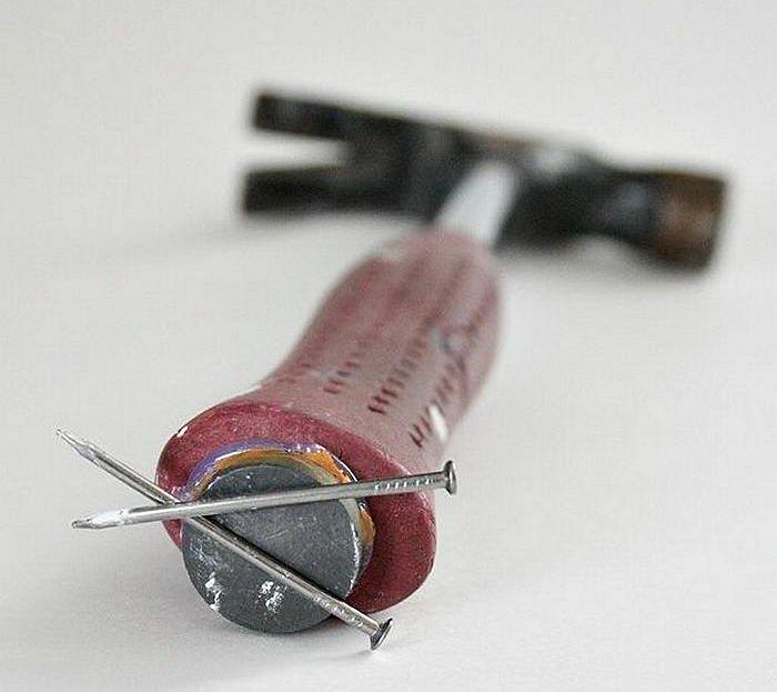 Приклейте небольшой магнит с обратной стороны молотка и вам больше не потребуется колоться гвоздями, которые находятся в кармане брюк или держать гвозди во рту. Действительно нужный лайфхак.