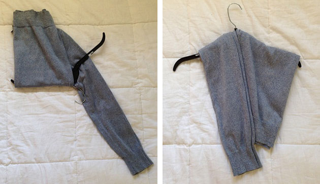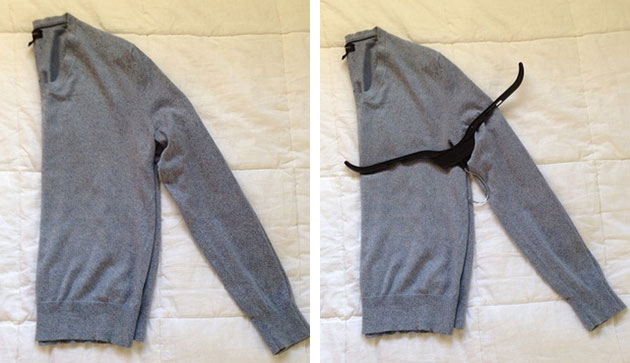 Зачастую места на полке в шкафу уже нет, а зимний свитер, который достаточно объемный, девать некуда. Для решения проблемы потребуются плечики и сам свитер. Повесьте его, как показано на изображении, чтобы он всегда оставался выглаженным и не растягивался в районе плеч.
