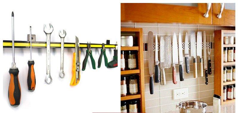 Зачастую такие инструменты, как отвертки, плоскогубцы, ключи и т.д. хаотично валяются на полке или в шкафчике, однако следующий лайфхак для дома поможет решить эту проблему. Раздобудьте магнитную планку и прикрепите ее к стене. Аналогичное решение подойдет и для кухни.