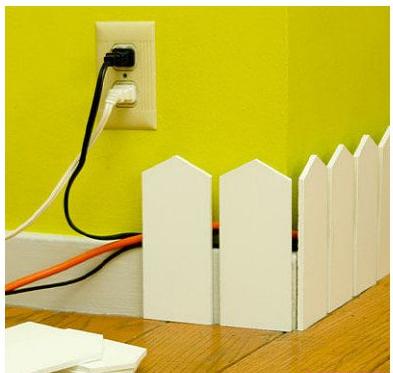 Часто на полу имеется масса проводов от бытовой техники или переносок, которые путаются под ногами. Назойливые провода можно красиво задекорировать или соорудить для них заборчик вдоль стенки.