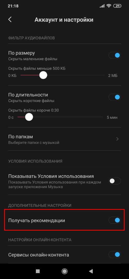 • Открываем приложение Музыка = Настройки => Расширенные настройки => убираем ползунок с Получать рекомендации;