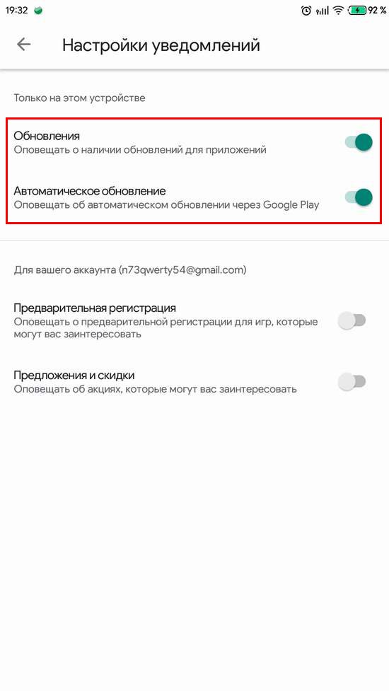 1. Открываем Google Play (Play Маркет) => Настройки => Уведомления и отключаем все ползунки;