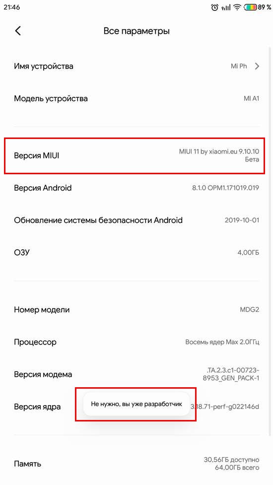 Чтобы открыть Меню для разработчиков, нужно зайти в Настройки смартфона => Все параметры => О телефоне => Версия MIUI и клацаем по этому пункту, пока не выскочит уведомление, что вы разработчик. Далее выходим в Настройки смартфона => Расширенные настройки => Для разработчиков.