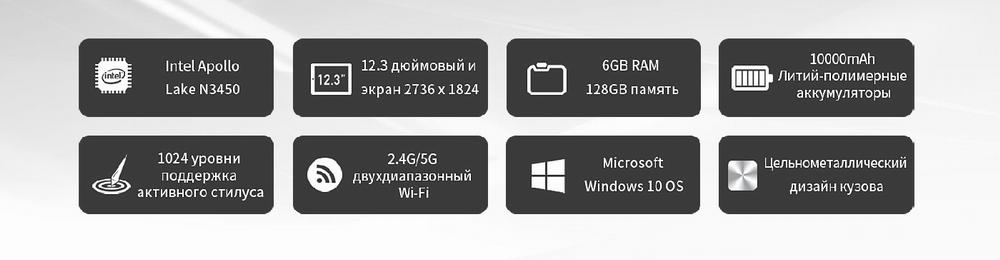 - Параметры дисплея: диагональ 12,3", матрица IPS, разрешение 2736х1824 пикселя, плотность 267ppi соотношение сторон 3:2, емкостный, мультитач;