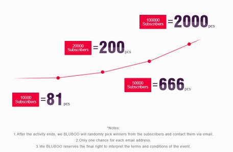 Срочная информация: на этой неделе Bluboo S1 станет доступным для предзаказа! Естественно, в честь старта продаж производитель решил провести акцию, чтобы привлечь больше внимание к безрамочному бюджетнику. Условия акции следующие: если в период с 20 по 30 июня на акцию подпишутся 100 000 человек, то среди них разыграют 2 000 Bluboo S1 - неплохая получается акция. Что нужно для этого сделать? Ввести свой e-mail на странице, которая скрывается за этой ссылкой. Если наберется меньше, чем 100 000 подписок, то смартфоны все равно будут разыгрываться. Вот график соотношения подписчиков и халявных смартфонов. blubah